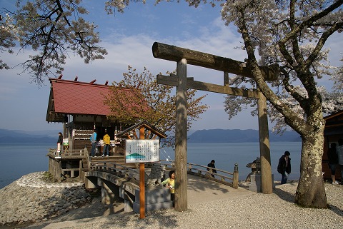 潟尻明神ともいい、1769年、秋田藩士 益戸滄州によって漢槎宮と命名されたことから、 この田沢湖のことを漢槎湖あるいはただ槎湖と呼ぶようになりました。拝殿正面に掲げられた漢槎宮の扁額は滄州が遊覧のおり、 船頭をつとめた少年 斎藤千太郎に書き与えたものです。