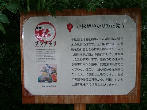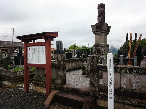 真田初代沼田藩主信幸(之)の婦人である大蓮院殿は、徳川家の重臣本田忠勝の娘で小松姫と呼ばれていた。家康は小松姫を養女として 天正17年(1589)に信幸に嫁がせた。翌年7月信幸は沼田城主となり、慶長5年(1600)の関ヶ原の役において徳川方に従い、 東軍に付くことになった。敵味方に分かれた信幸の父昌幸、弟信繁(幸村)が佐野犬伏から上田に帰る途次に沼田城を訪れた際、入城を拒んだ 大蓮院殿は女丈夫とうたわれた。元和6年(1620)に病み、2月に療養のため江戸から草津に来る途中の同月24日に武蔵国鴻巣で没した。 享年48歳。同所で火葬、分骨して同所勝願寺、沼田の正覚寺、上田の芳泉寺にそれぞれ葬られた。法名は大蓮院殿英誉皓月大禅定尼。
