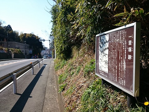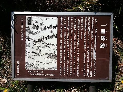 かつて、このあたりの道路の両側に一里塚がありました。一里塚は、主要な街道の一里(約4キロメートル)ごとに江戸幕府が 設けたもので、旅程の目印として利用されていました。崖上の高さまであった江戸時代の東海道を掘削改修しれのが現在の道路で、 一里塚も崖上にありましたが、今は何も残っていません。
