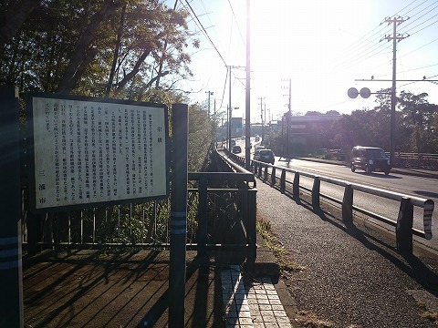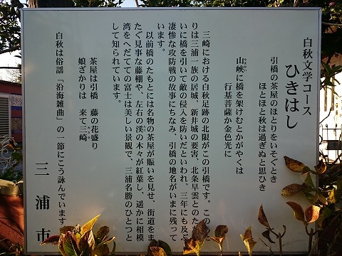 横須賀市の衣笠城を中心にして栄えた三浦一族は、三浦義澄の孫泰村が時の執権北条時頼と仲たがいとなり、 いわゆる宝治合戦がおこり、一族は滅びましたが、義澄の弟佐原十郎義連の系統が残り、その孫、盛時から八代 目の時高が永享10年(1438年)新井城を油壷に構築し、本拠を三浦に移しました。 この時高は世継ぎの問題から養子の義同と争い、明応3年(1494年)新井城で自殺するに至ったとの説が あり、三浦の城主となった義同は当時小田原を根拠とした北条早雲の勢力と対決、平塚市伊勢原市の両市にまた がる岡崎城、逗子市小坪の住吉城と各支城で敗退、最期のたのみを新井城に託して守りを固めました。ここ引橋 はそのときの大手、つまり外敵防御の第一線であったといわれ、谷間に橋を掛け渡し、敵が攻め寄せたとき、そ の橋を引いて防いだところから引橋の地名がおきたと伝えられています。