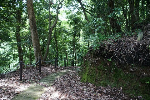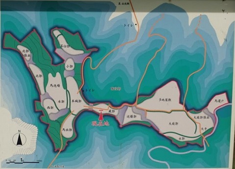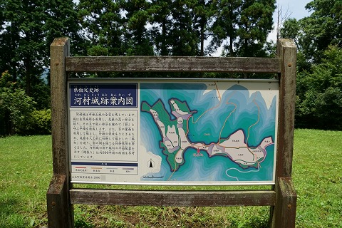 河村城中世山城の全容を残しています。城は自然地形を利用し、尾根の高い部分を削り、その土で低い部分を埋めて「郭」と呼ぶ平場を造成します。 また、谷や崖面を利用して堀とし、外敵の侵攻をさえぎるため、尾根を人工的に切断して堀とした「堀切」を造り、郭の間を隔てる防御態勢を整えました。河村城の郭や堀切の平面配置を示す「縄張り」は 約300年前の絵図を参考にしています。