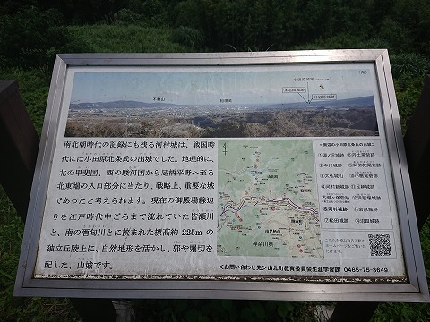 南北朝時代の記録にも残る河村城は、戦国時代には小田原北条氏の出城でした。地理的に、北の甲斐国、西の駿河国から足柄平野へ至る北東端の入口部分に当たり、 戦略上、重要な城であったと考えられます。現在の御殿場線辺りを江戸時代中ごろまで流れていた皆瀬川と、南の酒匂川とに挟まれた標高約225mの独立丘陵上に、自然地形を活かし、郭や堀切を配した、山城です。