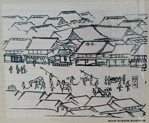 江戸幕府は、東海道を往来する幕府の役人や大名、公家などの専用宿舎として、各宿場に本陣を指定しました。江戸時代に 外交使節として日本を訪れた朝鮮通信使も国賓待遇の使節ということで、蒔田本陣に宿泊した記録があります。通常、本陣には その他の旧家や富裕層等、有力宿民が指定され、家屋の格式も特別なものでした。江戸時代の地誌「相中留恩記略」に記された 蒔田本陣の図からも、他とは画然とした本陣の様子が判ります。