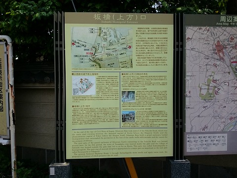 ここには板橋(上方)口矢来門がたてられ、出入り口周辺の土塁は特に石垣で厳重に補強されていました。また、東海道もこの土塁などの地形に