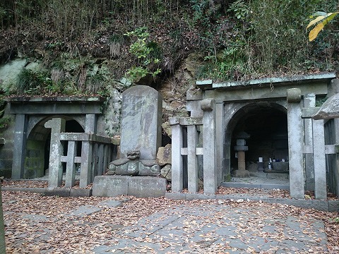 左が三浦泰村やぐら、中央鳥居が大江広元・毛利秀光の墓、右階段が島津忠久の墓