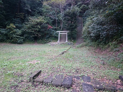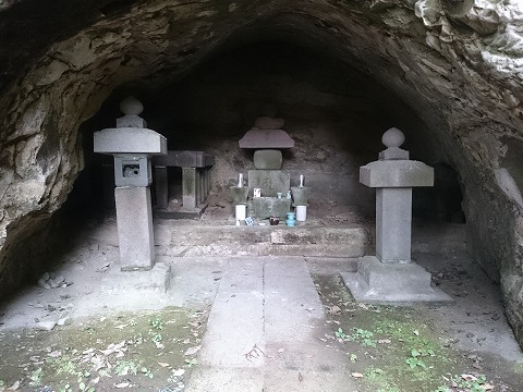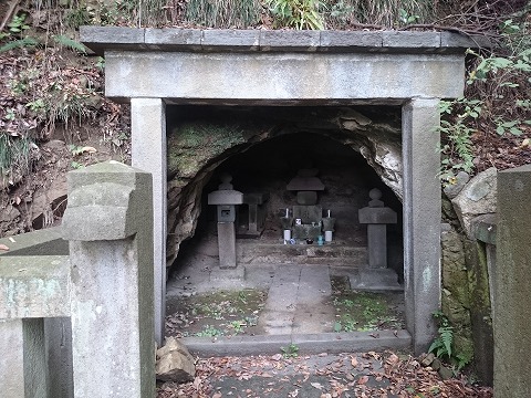左が三浦泰村やぐら、中央鳥居が大江広元・毛利秀光の墓、右階段が島津忠久の墓