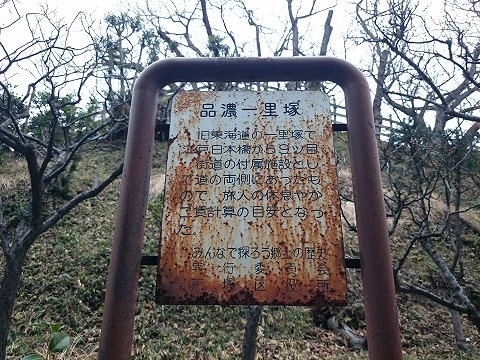 ここ品濃の一里塚は、日本橋から9番目の一里塚で、保土ヶ谷宿と戸塚宿の間に 位置しています。旧東海道をはさんでほぼ東西に2つの塚があり、地元では一里山と呼ばれていました。東の塚は平戸村内に 西の塚は品濃村内に位置し、西の塚にはエノキが植えられていたようです。