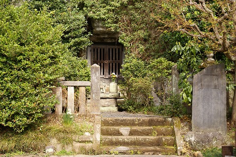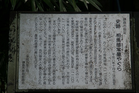 このやぐらは、古くから相馬師常(1139~1205)の墓と伝えられ、地元の人々に厚く保護されてきました。 玄室の平面形は矩形で、羨道を有し、奥壁の中央部には切石で塞がれた大きな龕があります。 龕の前に宝篋印塔が置かれています。