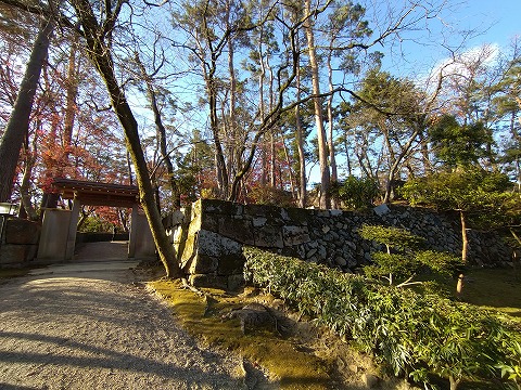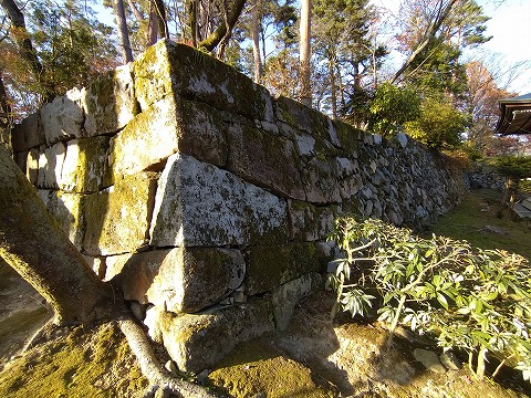 大正8年(1919)、荒廃していた城跡を、教団「大本」が買取り石垣を積み直し、「天恩卿」として神苑整備されました。昭和10年(1935)の大本弾圧事件で廃墟と化しましたが、戦後 同教団によって復興され、城跡のたたずまいとして残る石垣と清閑な森は、往時を偲ばせてくれます。