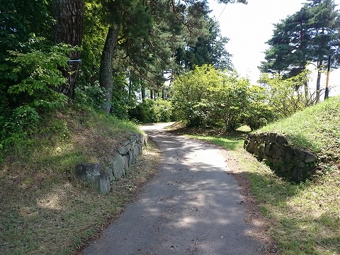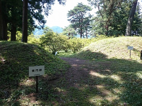 南方が表正面(大手口)で、石積みで固めた土塁を築き、枡形も残っているが、北側土塁に設けられた裏面(搦手口)と考えられる虎口には枡形は無い。