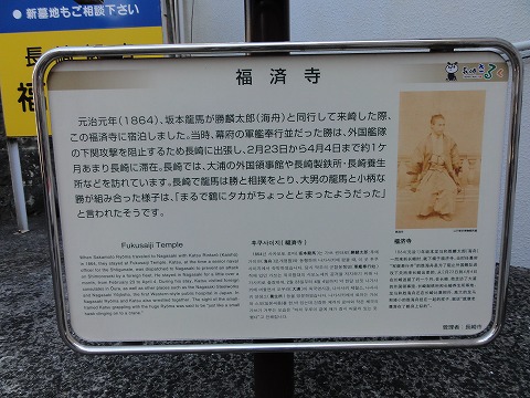 元治元年(1864)、坂本龍馬が勝麟太郎(海舟)と同行して来崎した際、この福済寺に宿泊しました。当時、幕府の軍艦奉行並だった勝は、外国艦隊の下関攻撃を阻止するため長崎に出張し、2月23日から4月4日まで約1ヶ月あまり長崎に滞在。長崎では、大浦の外国領事館や長崎製鉄所・長崎養生所などを訪れています。長崎で龍馬は勝と相撲をとり、大男の龍馬と小柄な勝が組合った様子は、「まるで鶴にタカがちょっととまったようだった」と言われたそうです。