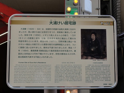 大浦慶(1828~84)は、油屋町の老舗の油商大浦家に生まれましたが、若い頃から油には見切りをつけ、茶貿易に着目していました。安政3年(1856)、イギリス商人オルトとの間で、1万斤(6トン)の貿易に成功、以後、日本茶を海外に輸出して莫大な利益を得たといいます。明治4年(1871)、元熊本藩士遠山一也がオルト商会との間で行った煙草の取引の連帯保証人となり、ついに破産に追い込まれました。晩年は不遇でありましたが、明治17年(1884)、農商務卿 西郷従道より製茶貿易の功労を賞され、褒賞状と功労金20円を下賜されています。同宅の敷地は426坪、庭は長崎を代表する平庭といわれました。