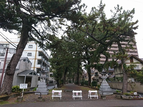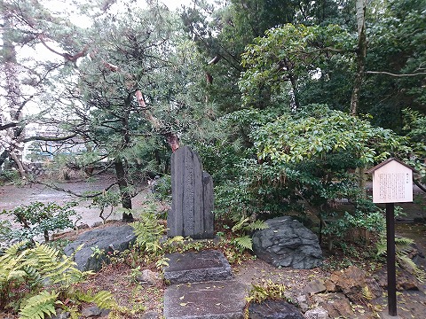 やがて「濱松名稱起源颯々之松」の石碑が建立されましたが、松林は昭和20年の空襲により焼失。再び松が植えられ様々な変遷を経て、 平成23年に石碑は境内に移され、5代目お松が植栽されています。