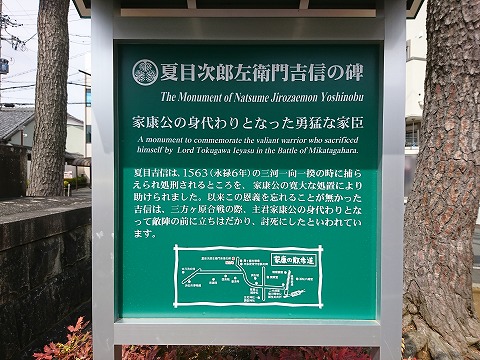 夏目吉信は、1563(永禄6年)の三河一向一揆の時に捕らえられ処刑されるところを、家康公の寛大な処置により助けられました。 以来この恩義を忘れることが無かった吉信は、三方ヶ原合戦の際、主君家康公の身代わりとなって 敵陣の前に立ちはだかり、討死にしたといわれています。