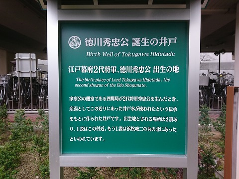 家康公の側室である西郷局が2代将軍秀忠公を生んだとき、産湯としてこの辺りにあった井戸水が使われた という伝承をもとに作られた井戸です。出生地とされる場所は2説あり、1説はこの付近。もう1説は 浜松城二の丸の北にあったといわれています。