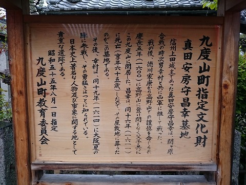 戦の後、徳川家康から高野山での謹慎を命じられ慶長5年(1600)に高野山に登り、 間もなく父子共にこの九度山に閉居した。昌幸は、同16年(1611)に死亡(享年65歳)したので、 その屋敷地に葬ったのがこの墓地である。